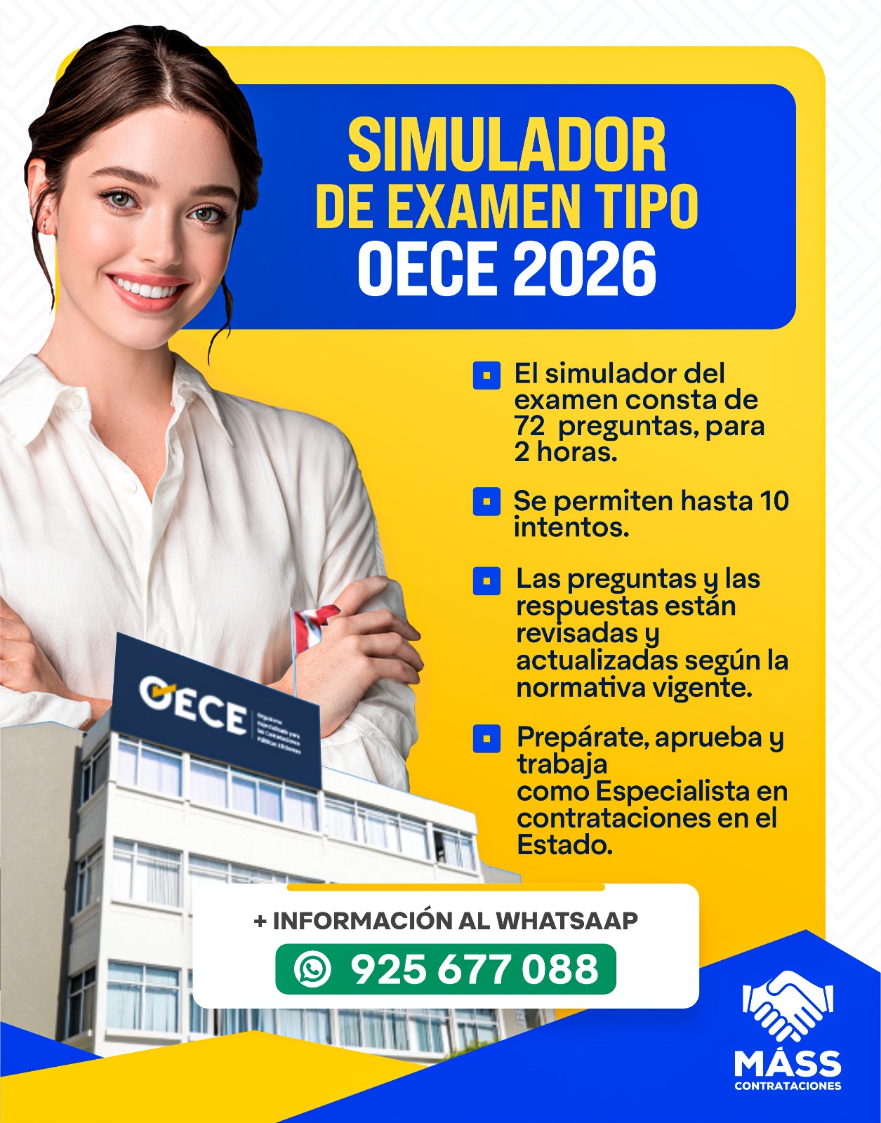 El Simulador Examen Tipo OECE 2025 de Máss Contrataciones, tiene 72 preguntas. Cada pregunta esta cuidadosamente seleccionada y revisada según la normativa de contrataciones vigente.