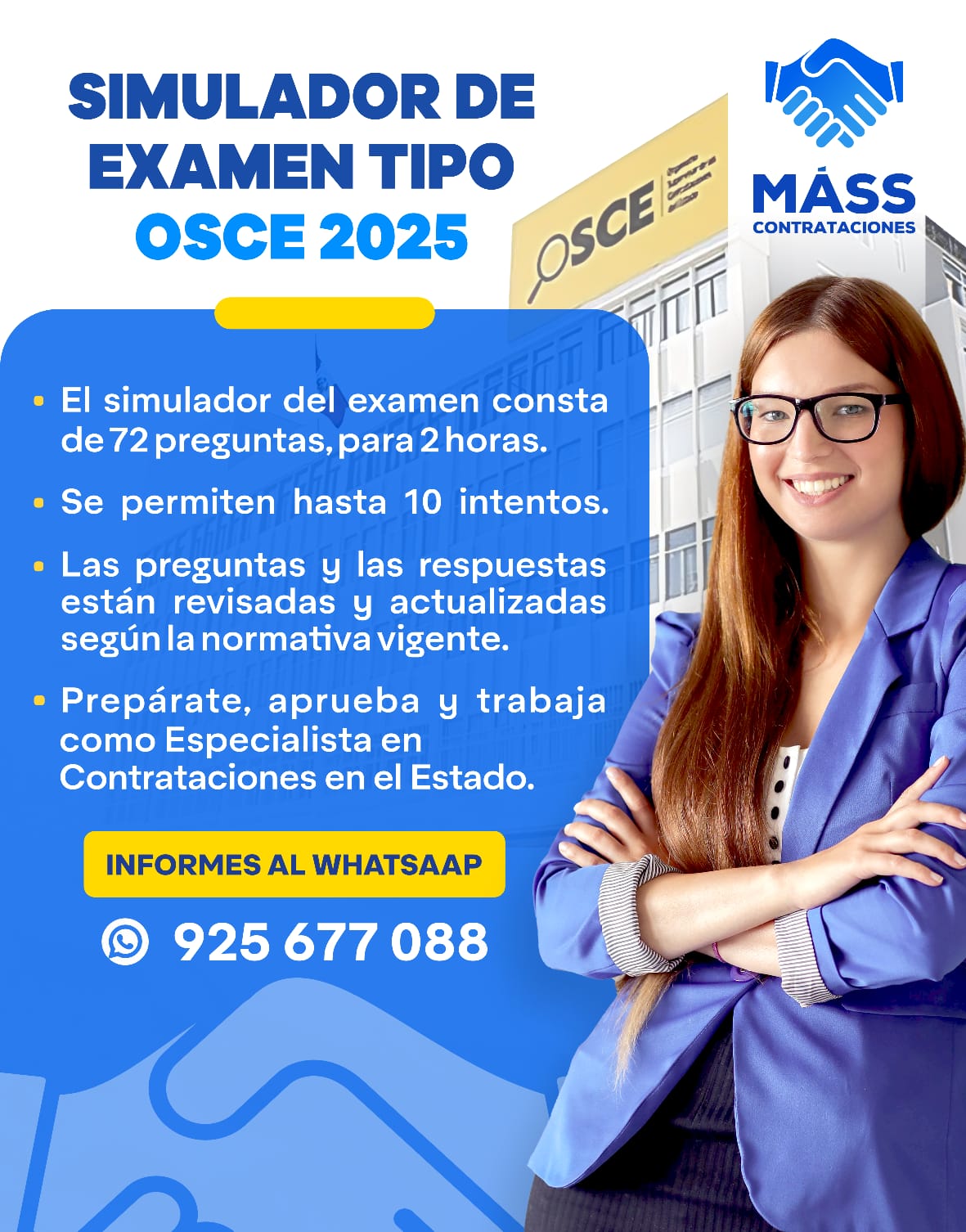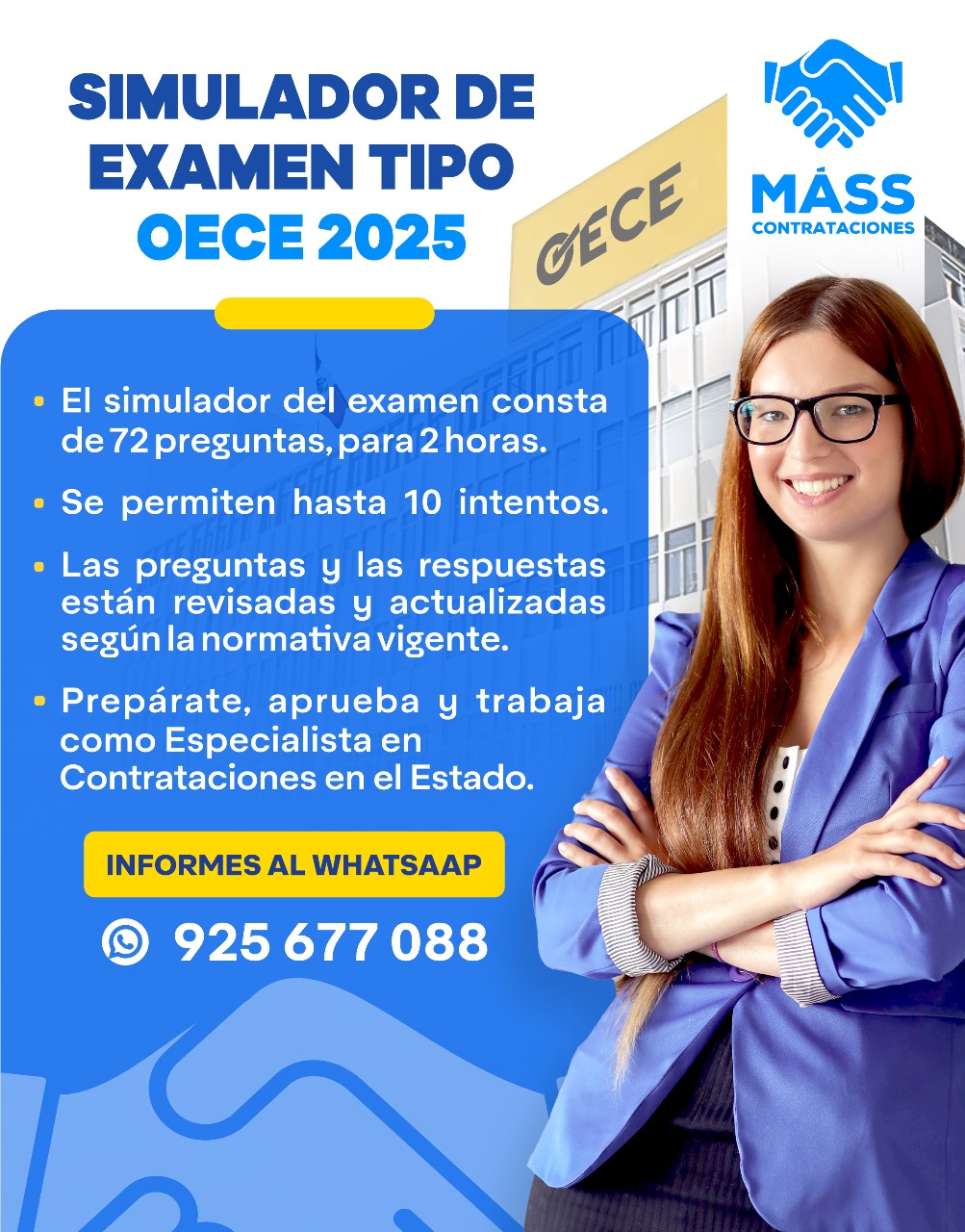 El Simulador Examen Tipo OECE 2025 de Máss Contrataciones, tiene 72 preguntas. Cada pregunta esta cuidadosamente seleccionada y revisada según la normativa de contrataciones vigente.