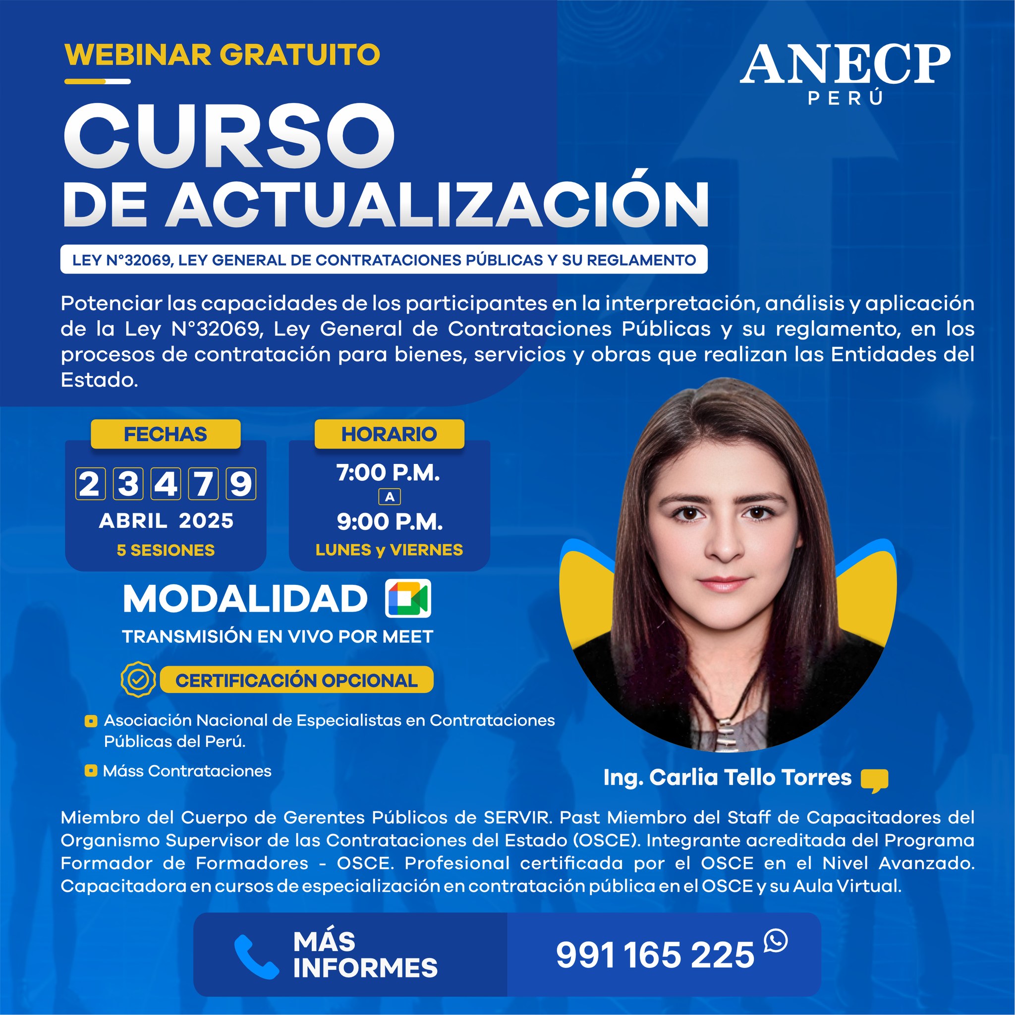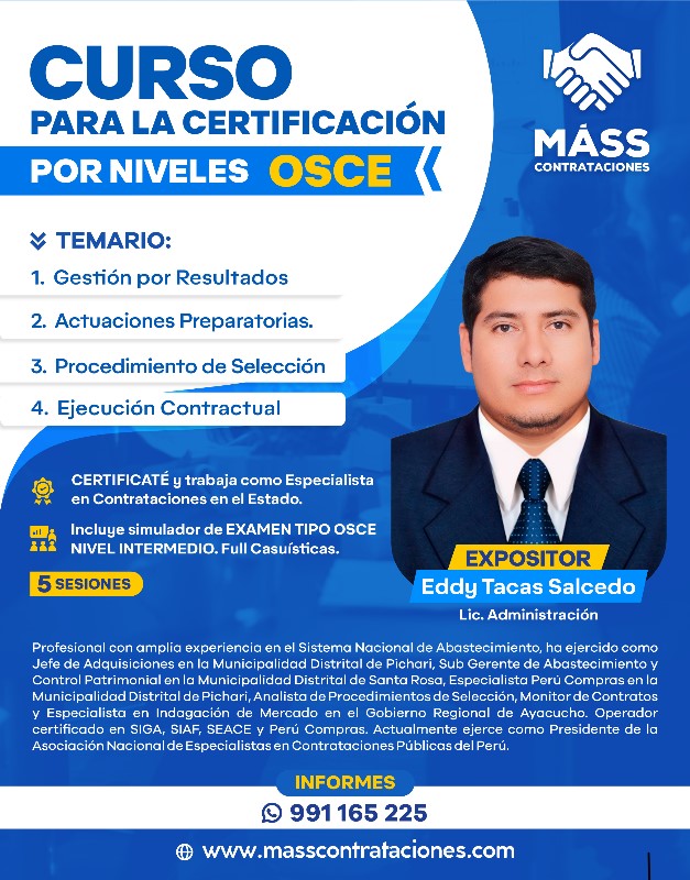 Objetivo: Potenciar las capacidades de los participantes en la interpretación, análisis y aplicación de la Ley N° 32069, Ley General de Contrataciones Públicas y su reglamento, en los procesos de contratación para bienes, servicios y obras que realizan las entidades del Estado.